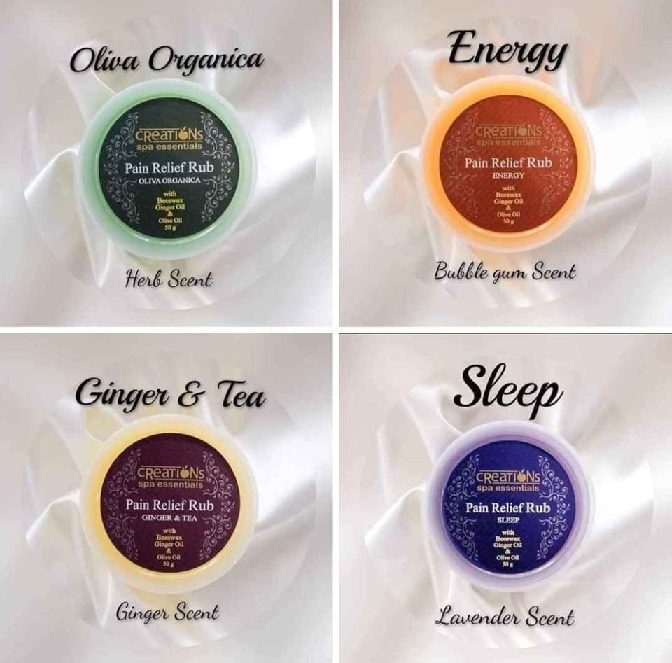 BEAT the PAIN and STRESS with the power of natural aromas that soothes and relaxes your MIND and BODY Get rid of you old scented rubs…Try our Creations Spa Essentials Pain Relief Rub Available in 4 scents: Lavander scent, our best seller Ginger and tea scent Bubblegum/Orange scent Olive scentPm for orders